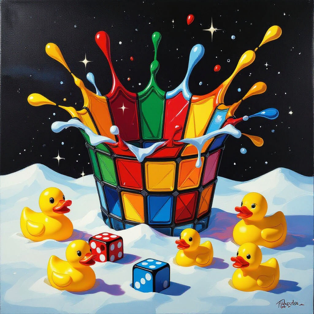This image shows a vibrant, high-contrast composition reminiscent of leaded glass, featuring elements like rubber duckies, Rubik's Cubes, dice, and Lego bricks. The piece has a melting gouache effect.