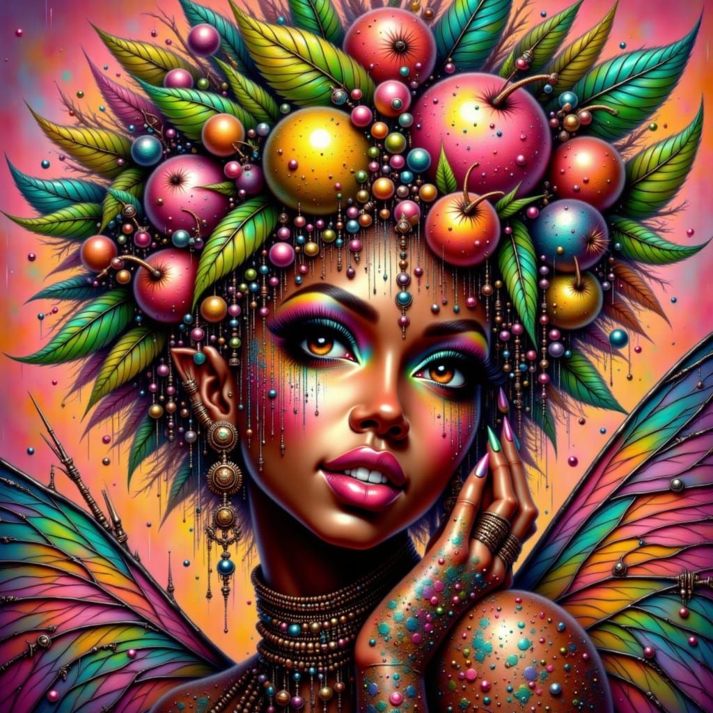 A vibrant image of a Black cabaret dancer in a sequined fruit costume. The artwork evokes the style of Harlem Renaissance painters, using textured brushstrokes to capture her beauty and intelligence.