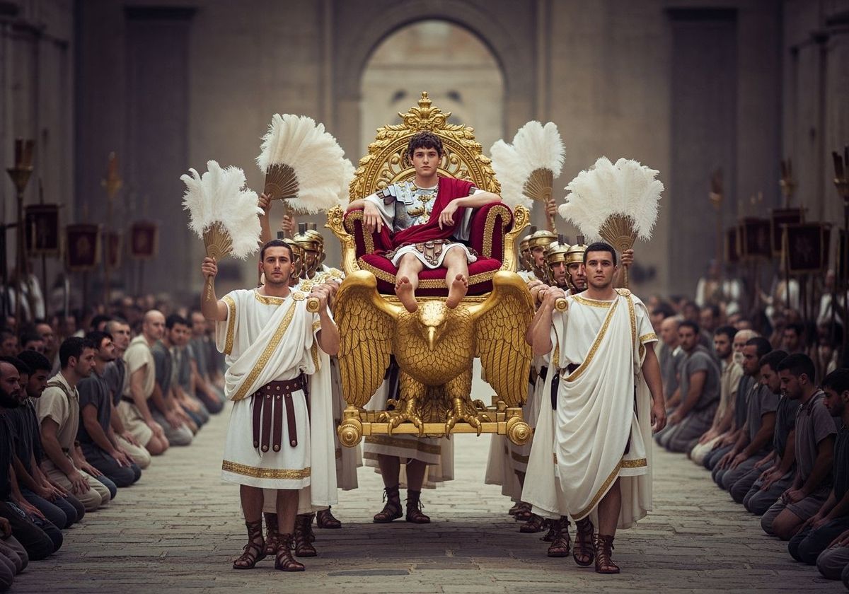 This image shows a Roman Emperor being carried on a golden eagle litter by soldiers. Servants fan him as his retinue passes kneeling peasants. The scene evokes theatrical and surreal photography.