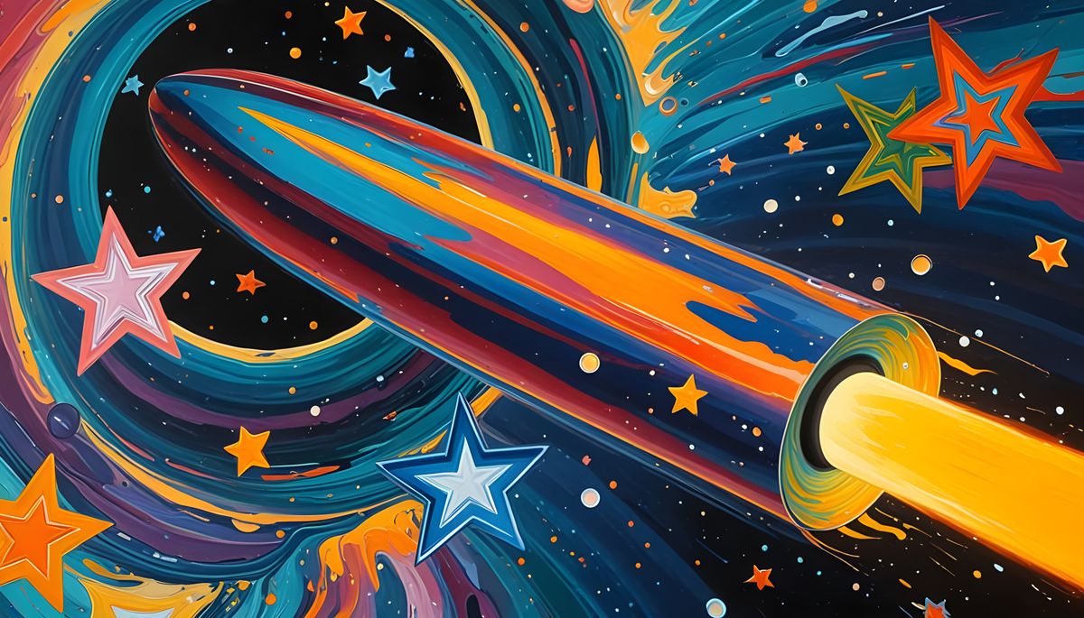 This image shows a mesmerizing, abstract depiction of a high-velocity, iridescent cylinder in a maelstrom of plasma and stars, with bold, clashing colors and thick, textured brushstrokes reminiscent of avant-garde expressionism.