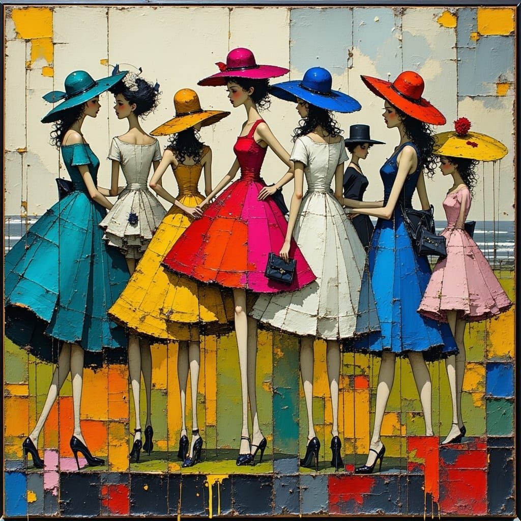 This image shows a group of stylish women at the horse races. The artwork features vibrant colors and abstract realism, with expressive brushstrokes reminiscent of famous 20th-century artists.