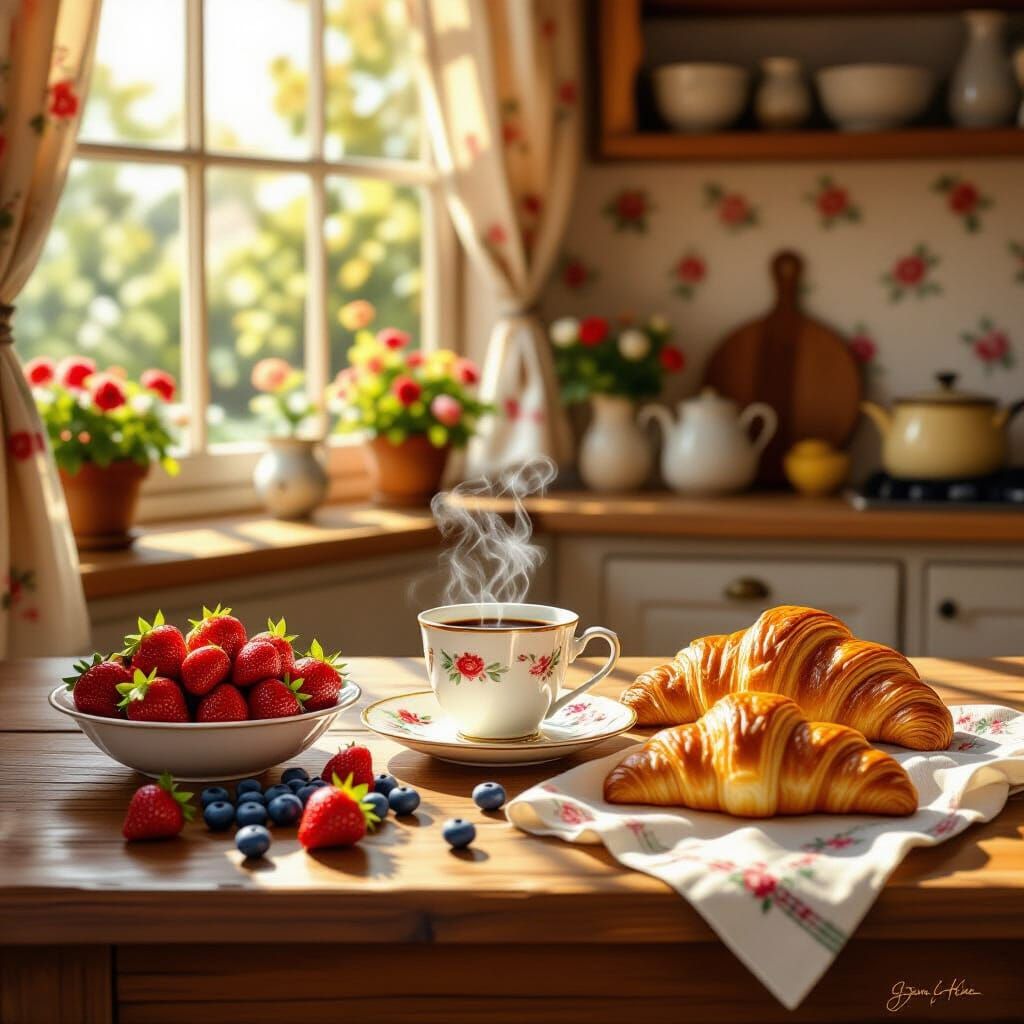 This digital painting captures a serene kitchen bathed in warm morning light, featuring a table laden with fruit and pastries, a steaming coffee cup, and soft shadows, evoking a sense of nostalgic tranquility.