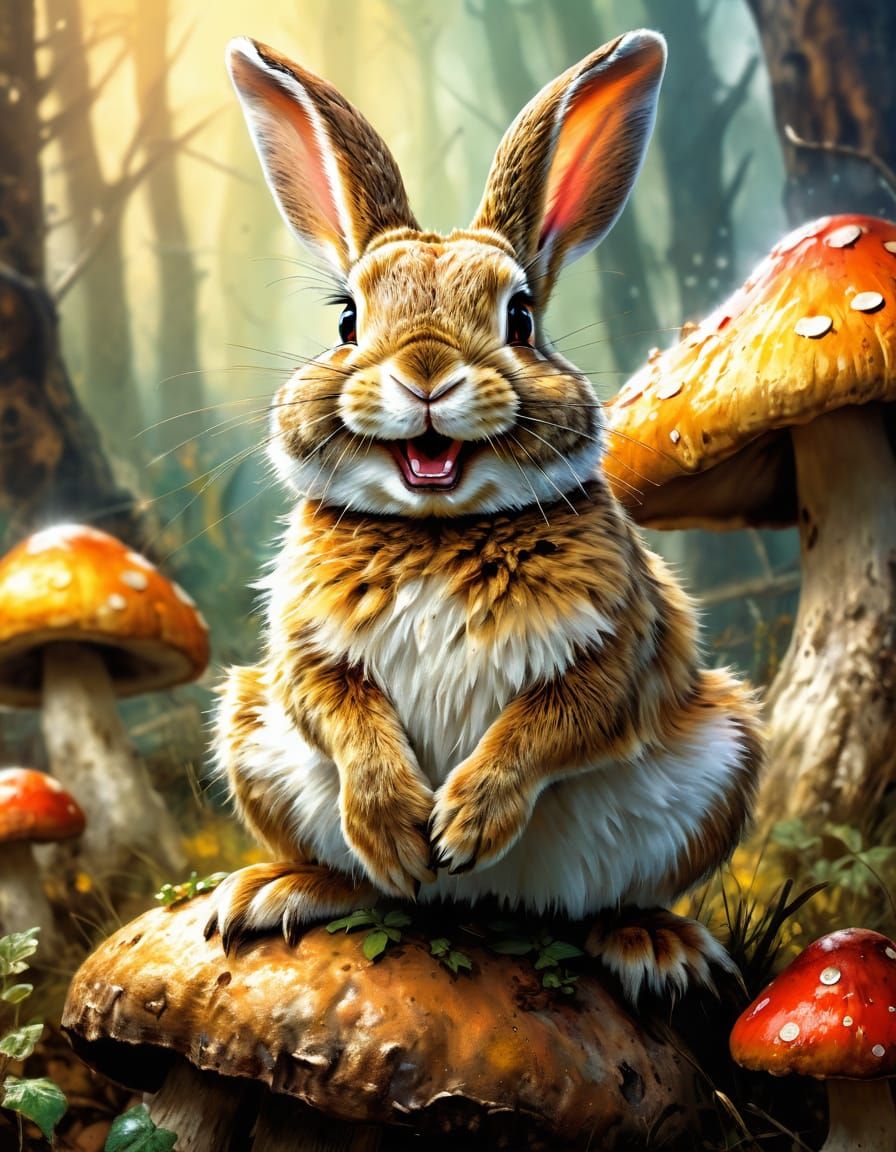 A digital painting showcases a laughing bunny perched on a mushroom. The comic book art style features vibrant, colorful fur and exaggerated facial expressions with warm, golden lighting.