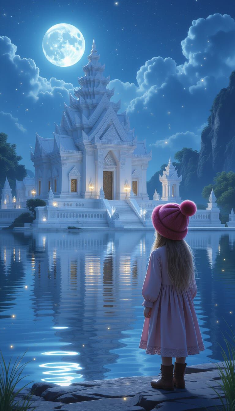 A hyperrealistic fantasy scene featuring an ancient marble and crystal temple on a mirrored lake under a full moon. A young girl gazes at the magical, ethereal display.