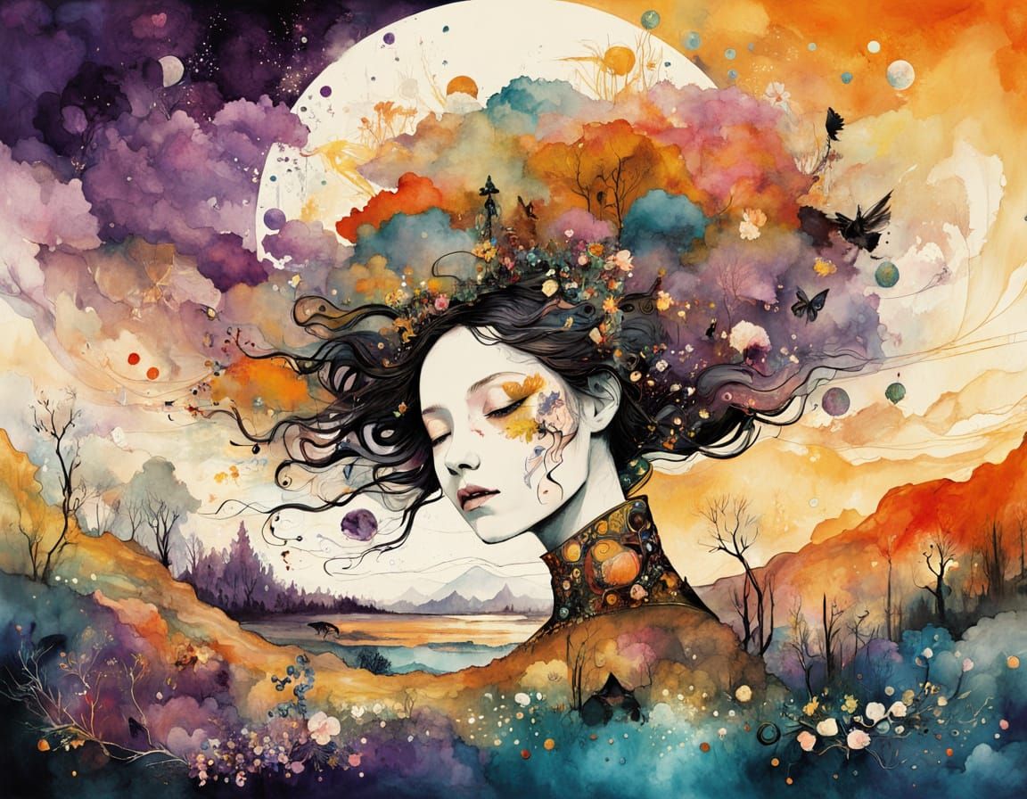 A vibrant image of a woman in a wildflower meadow at sunset. This colourful piece features rich textures and layers, with influences of mosaic design and abstractionism, rendered in a vintage watercolor style.