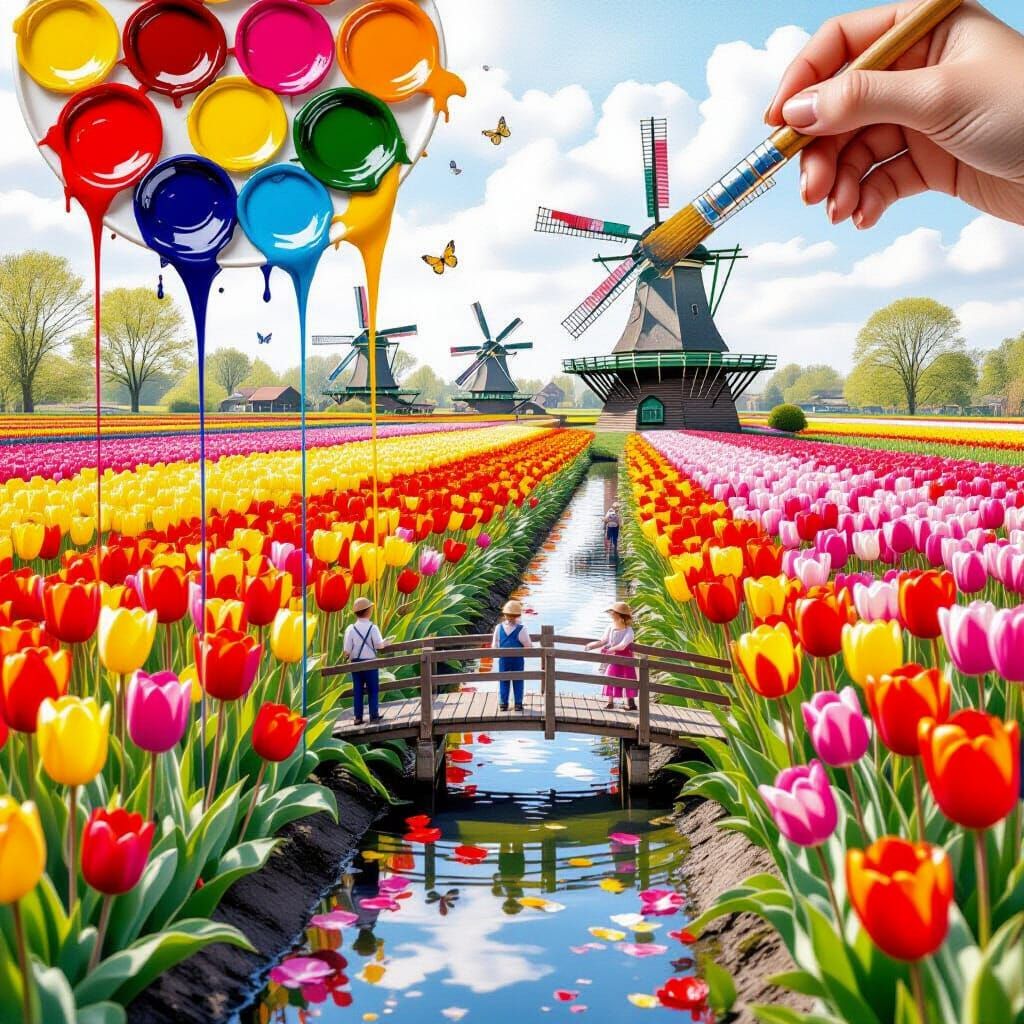 This image shows watercolor paints forming a 3D Dutch tulip field with windmills and bridges. Miniature figures and butterflies materialize from the flowing colors in a cheerful scene.