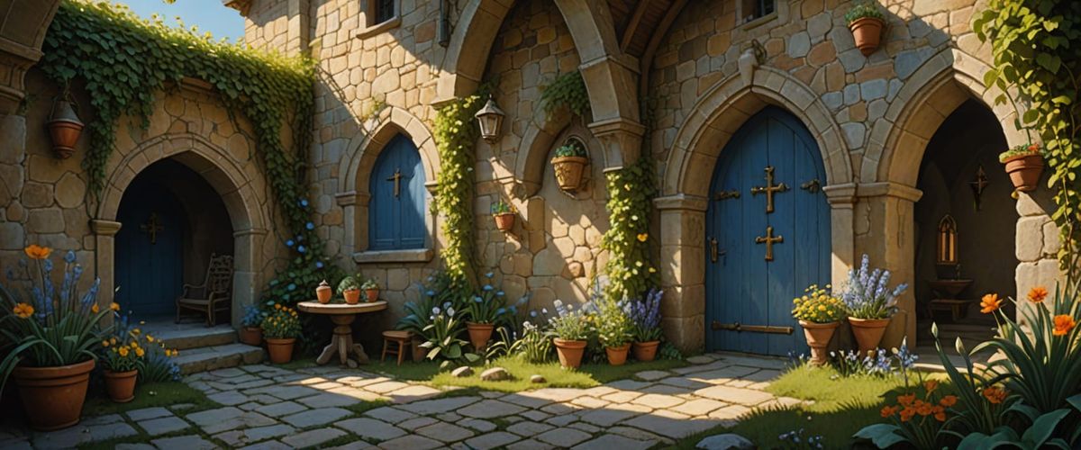 A vibrant image of mysterious passageways with colorful stone walls, accented by flowers and arches. The scene is bathed in clear blue daylight with sunrays and volumetric lighting, rendered in a cheerful, bright style.