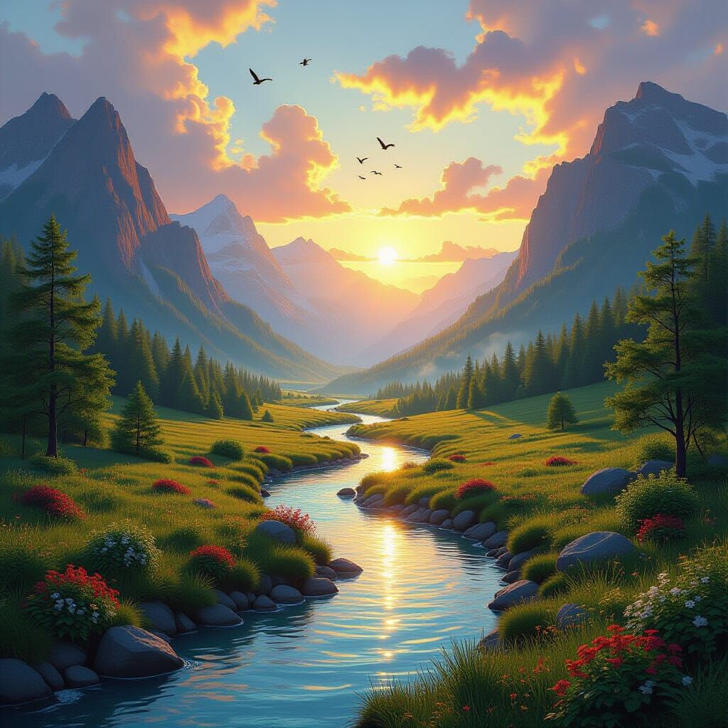 This hyperdetailed digital painting showcases a serene hidden valley at sunset. A crystal river reflects vibrant skies amidst lush forests and mountains, creating a tranquil, surreal scene.