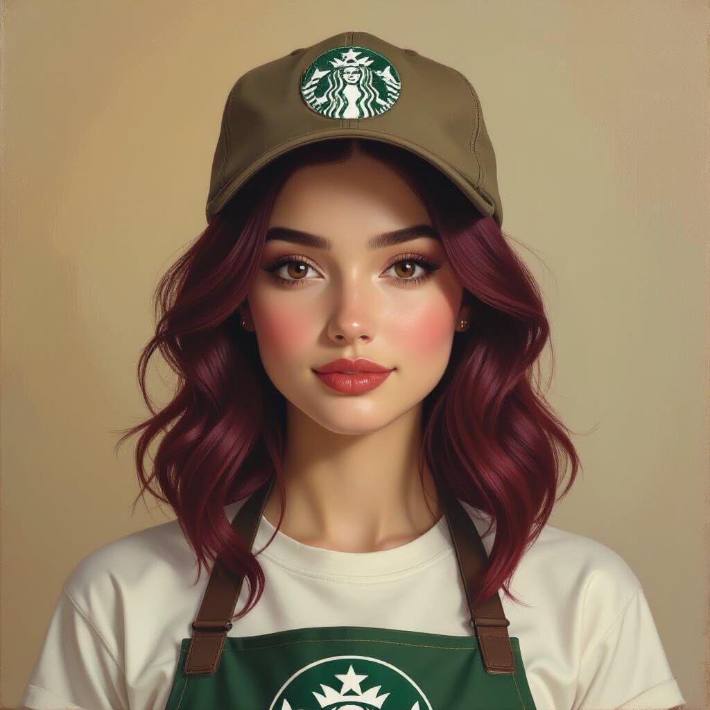 This image is a realistic oil painting of a 19-year-old woman with wine-red hair and dark brown eyes. She is depicted wearing a Starbucks cap and apron, rendered with soft, warm lighting.