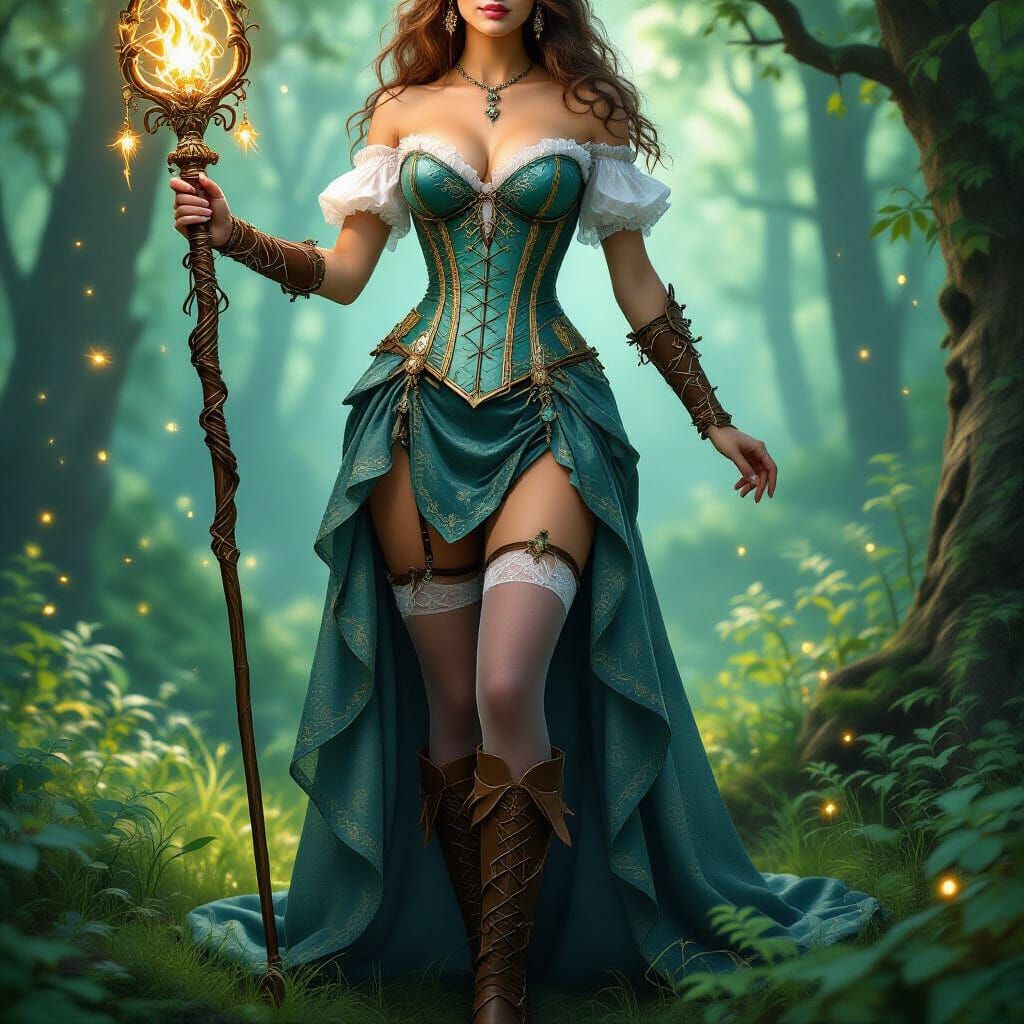 A captivating sorceress stands in a forest clearing, holding a gem-encrusted staff. She wears an embroidered corset, sheer stockings, and leather boots, illuminated by magical fireflies in a whimsical art style.
