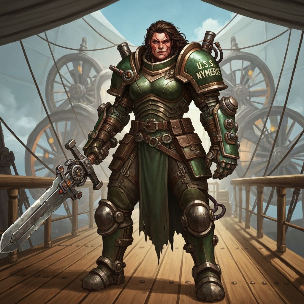 This concept art features Torina, a powerful warrior in detailed steampunk armor, standing ready for battle on an airship deck. Dynamic lighting and mechanical accents highlight her strength.