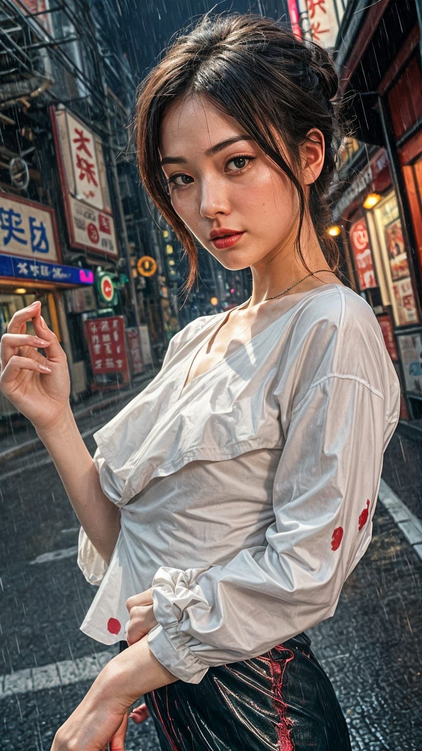 This image showcases a stunning Japanese woman in a dark red, bloodstained gown, standing confidently in a rain-soaked Tokyo alley. Soft reflections and warm neon lights create a moody, cinematic atmosphere.