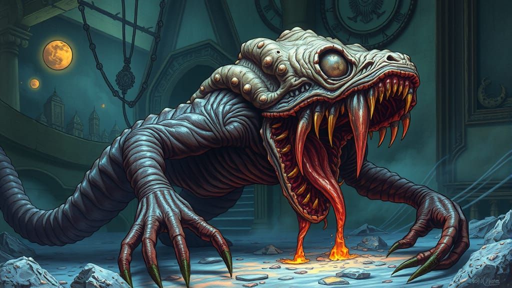 A surreal, grotesque monster illustration with deep colors. The artwork evokes the distinctive style of Moebius, featuring intricate details and a focus on vivid, unsettling imagery.
