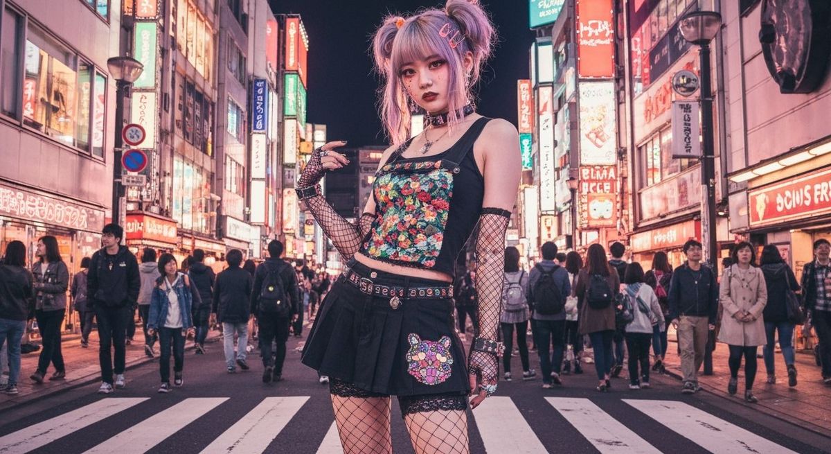 A digital artwork showing a punk gyaru girl in Tokyo. This image captures the energy of Japanese pop art with vibrant colors and textures in a dynamic composition.