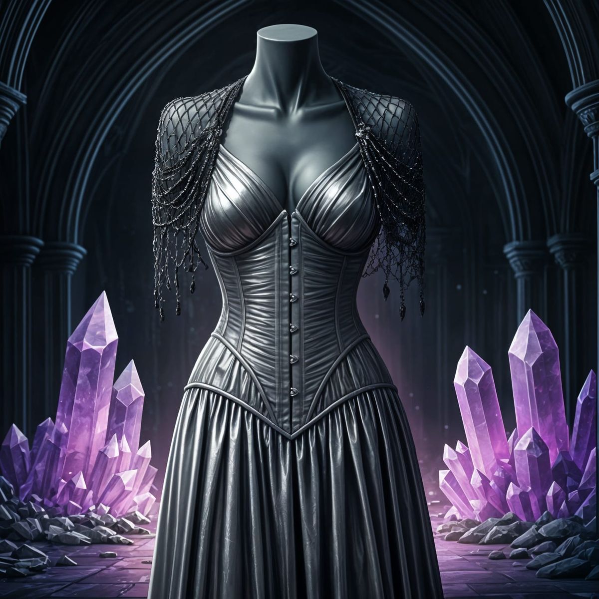 This image shows a dark elf woman wearing an alluring silver evening dress. The dress features metallic fabric layered with black lace and a netted shoulder wrap, all displayed under violet crystals.