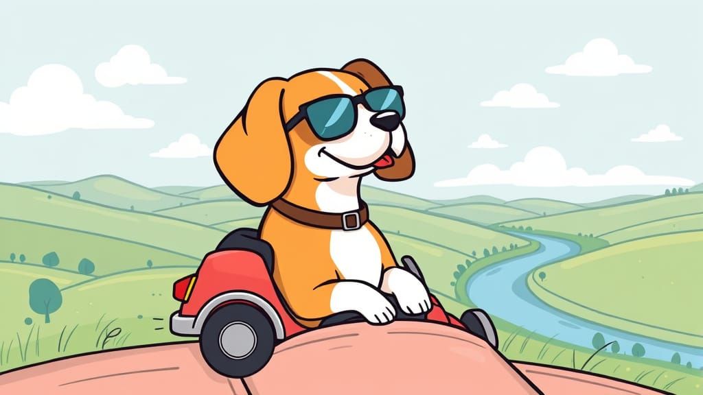 A cartoon beagle dog with sunglasses is driving a car. The full-body illustration features vibrant colors and minimalist line art. The background shows rolling hills and white clouds, in a children's illustration style.