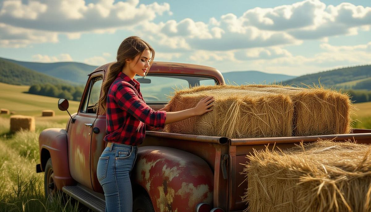 This image shows a woman in jeans and a plaid shirt loading hay bales into a pickup truck. Rolling hills fill the background of this photorealistic country scene.