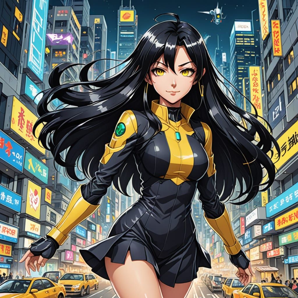 This image shows an android woman with long black hair and yellow eyes flying through a futuristic cityscape. The artwork is reminiscent of vintage anime.