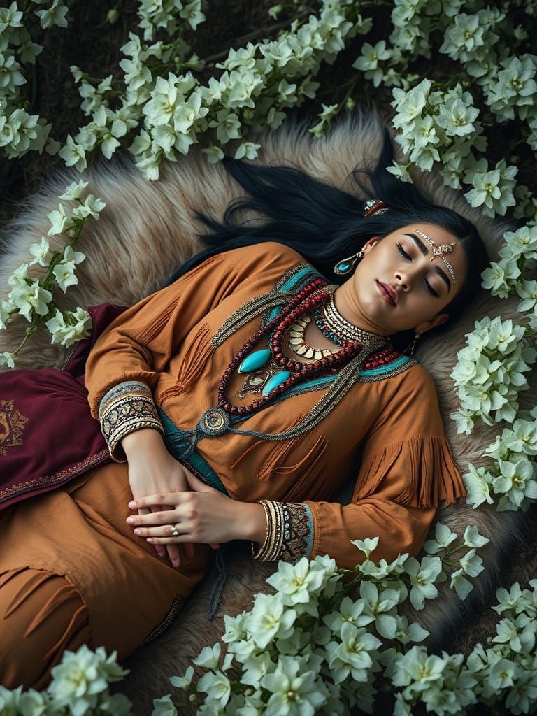 This image depicts a Native American woman reclining on a bed of fur, surrounded by a lush bloom of delicate Jade Vine flowers, in a dramatic, cinematic scene with meticulous details and atmospheric lighting, characteristic of a maximalist digital matte painting aesthetic.