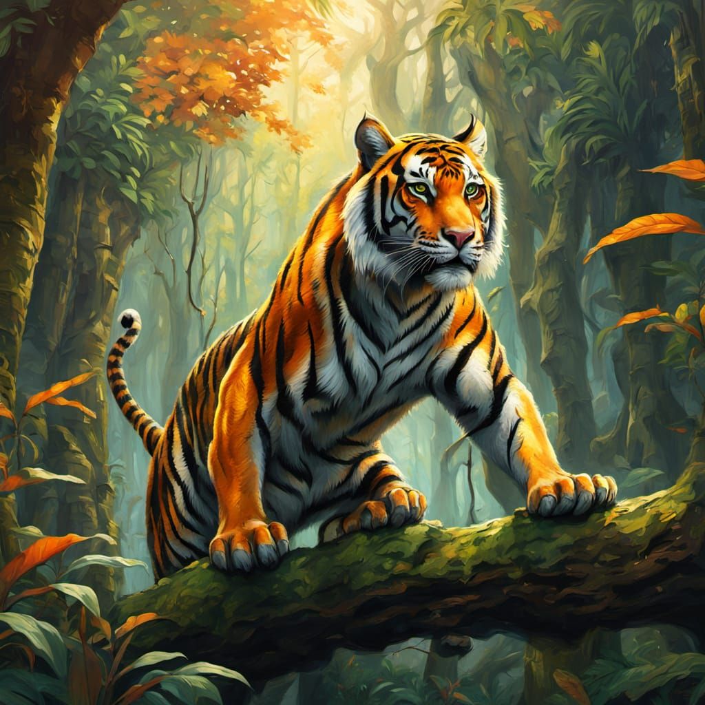 A striking picture of a tiger-striped dryad stalking through a jungle temple. The digital art features ancient runes, blazing orange leaves, and golden light in a soft, mystical atmosphere.