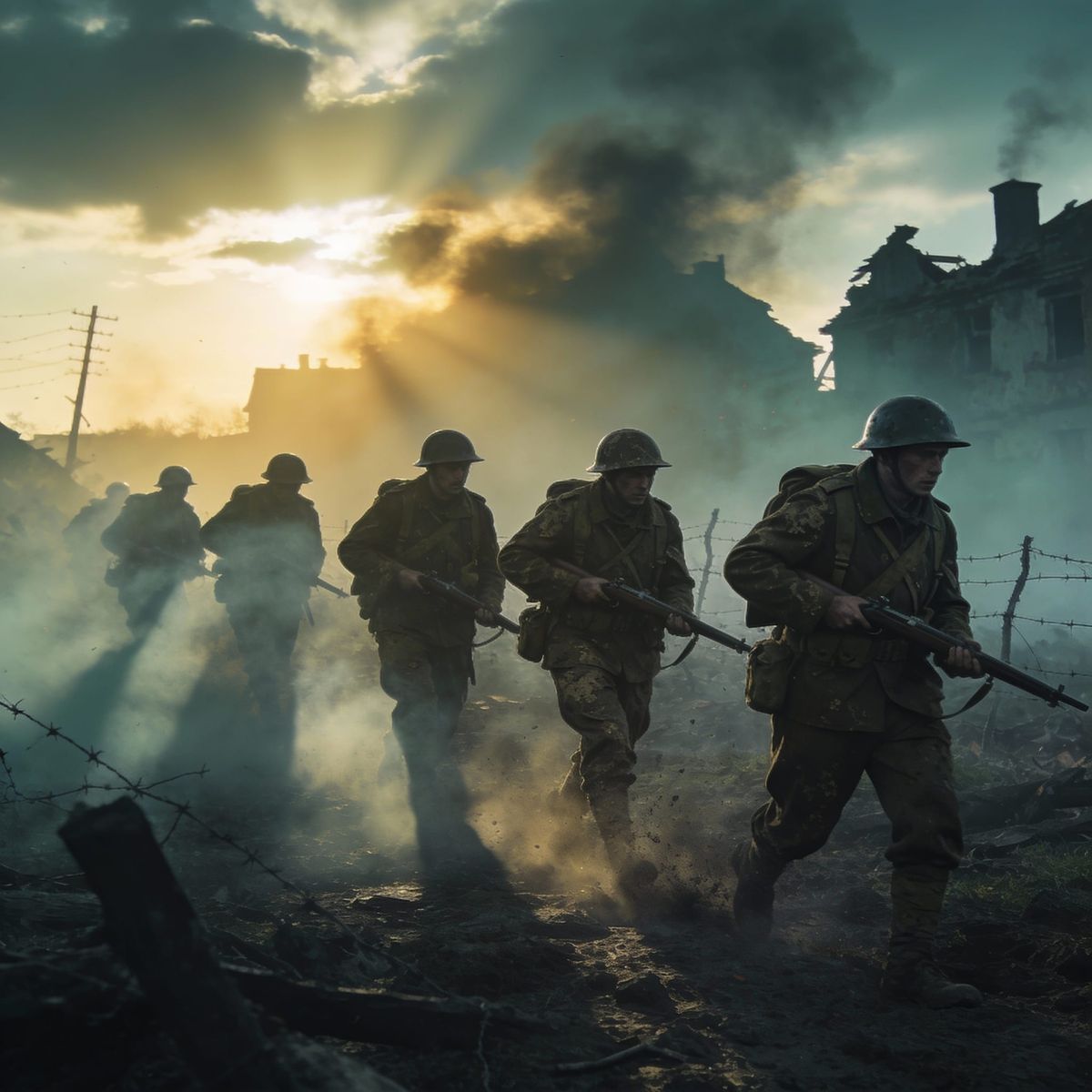 This image captures weary WWII soldiers advancing through thick fog and smoke at dawn. Cinematic lighting and a subdued color palette enhance the realistic, poetic atmosphere of war photography.