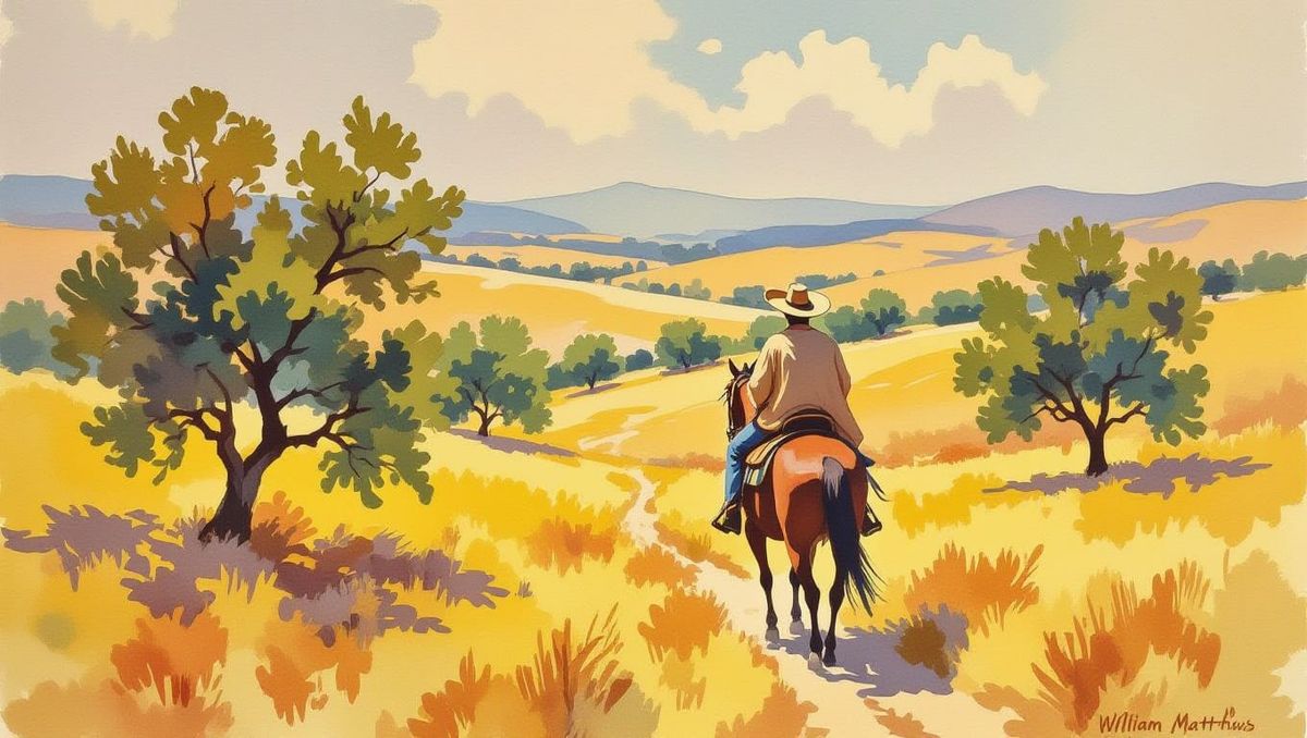 A beautiful watercolor painting in an impressionistic style of a lone vaquero on horseback traveling through a landscape of rolling hills and walnut trees in muted colors.