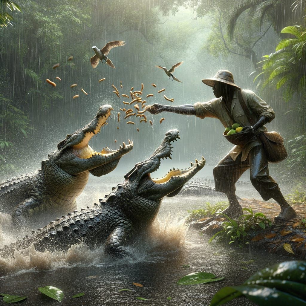 This realistic image captures a tense moment as a conservationist tosses food to three crocodiles in a heavy rain. Dynamic action with water splashing highlights the wild, natural atmosphere.