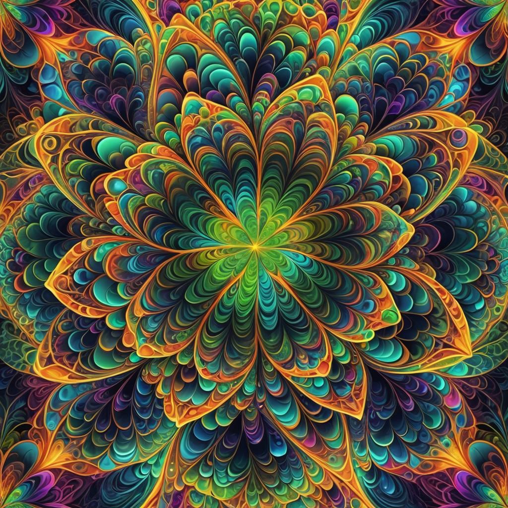 This image shows a four-leaf clover displaying a vibrant rainbow pattern. The abstract vector fractal art features high contrast, neon hues, subtle 3D shading, and iridescent colors, creating a psychedelic effect.