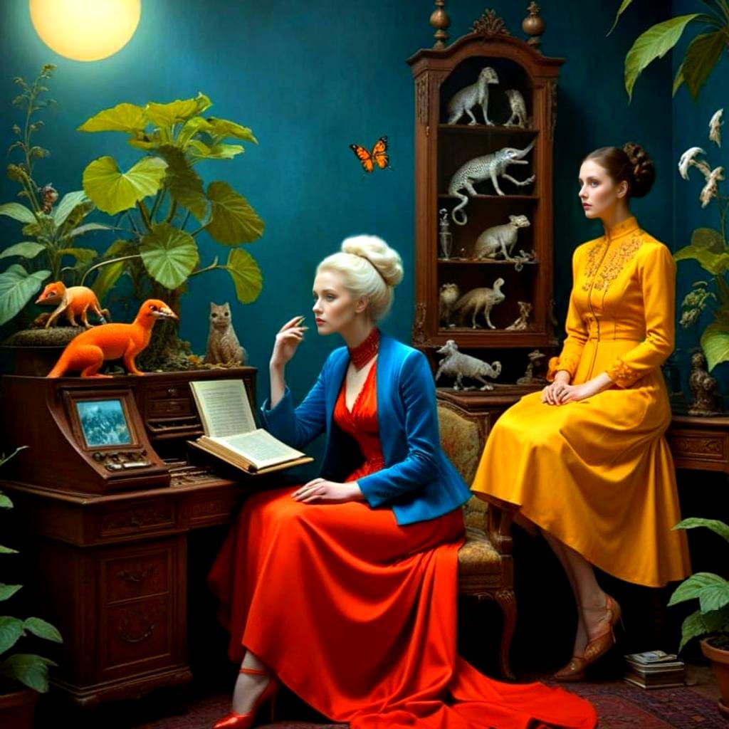 full height image of mysterious exotically dressed 40-year-old ladies with harmless fantastic animal creatures in fantastic forest, mystical realism, surrealism, hyperrealism, pre-Raphaelism; by Dante Gabriel Rossetti, Edward Burne-Jones, Paul Delvaux, Gertrude Abercrombie, Mikhail Vrubel, Andreas Lie, ...