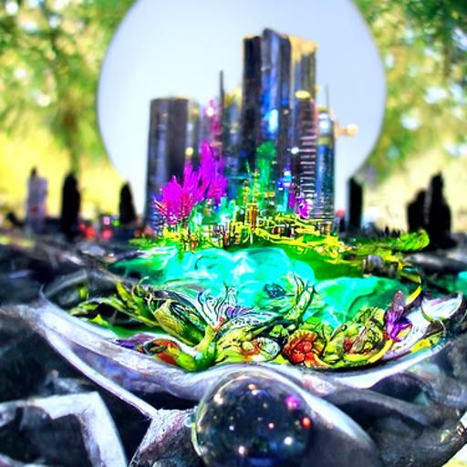 This image shows a sprawling cityscape blending nature and technology. The artwork features cosmic and holographic elements, rendered in a vibrant, astral style reminiscent of mixed media art.