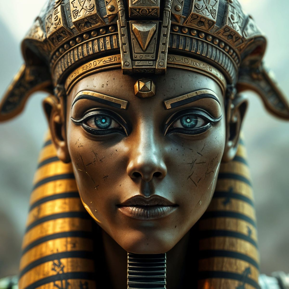 This image shows a futuristic goddess with an Egyptian-inspired golden headdress and piercing blue eyes, blending ancient and modern elements in a striking cyberpunk aesthetic.