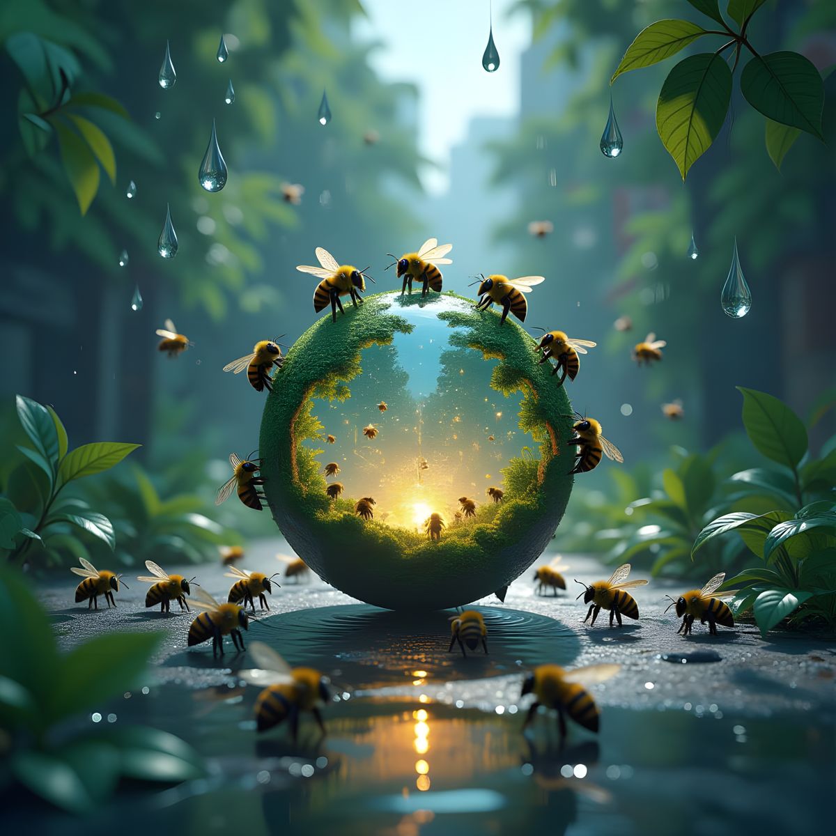 This image shows a magic orb in a vibrant city, encircled by bees and lush greenery. Rendered with intricate detail and deep shadows, it evokes a photorealistic yet stylized 3D aesthetic.