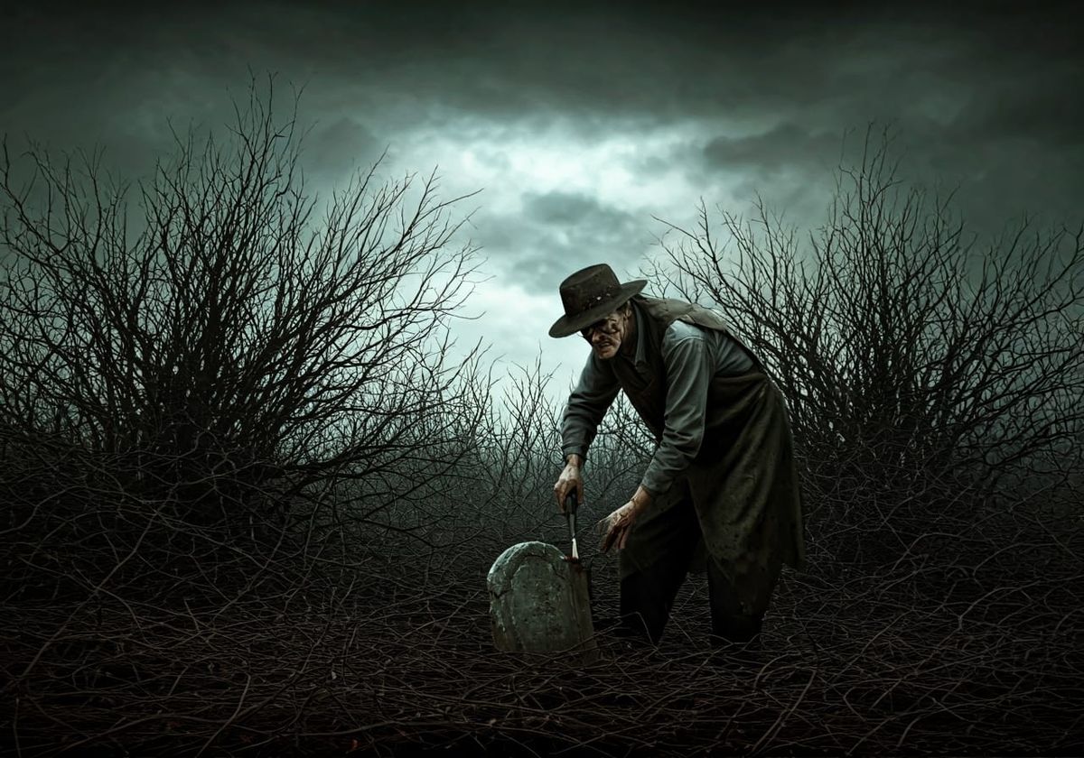 This image shows a sinister gardener tending to a neglected garden with dead bushes and a hidden tombstone, set against a dark daytime sky. The scene blends gothic and industrial styles.