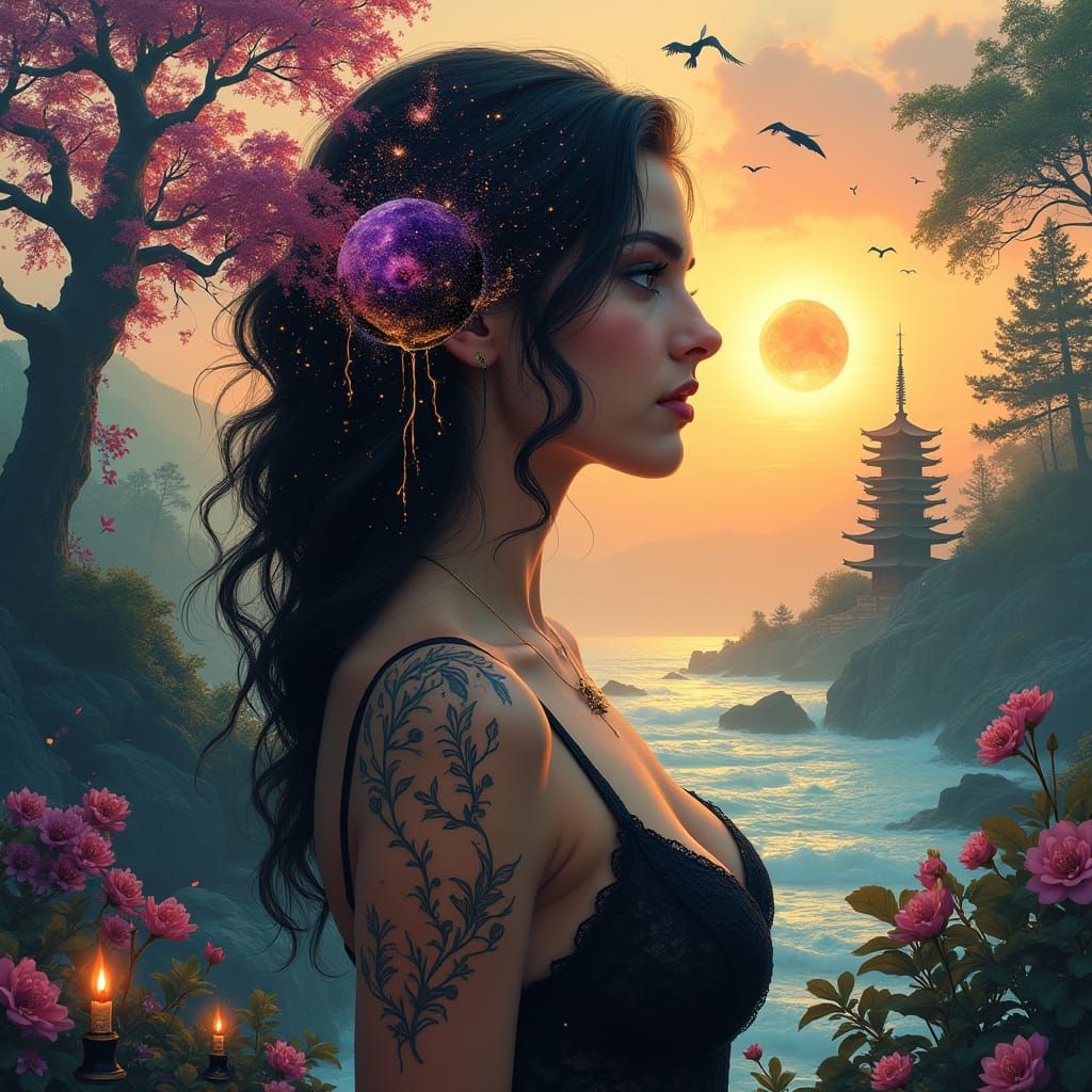 A mystical portrait of a young woman surrounded by blooming purple flowers, cauldrons, and ritual objects in a dark forest setting, blending her form with a sunset ocean scene in a dreamlike atmosphere.