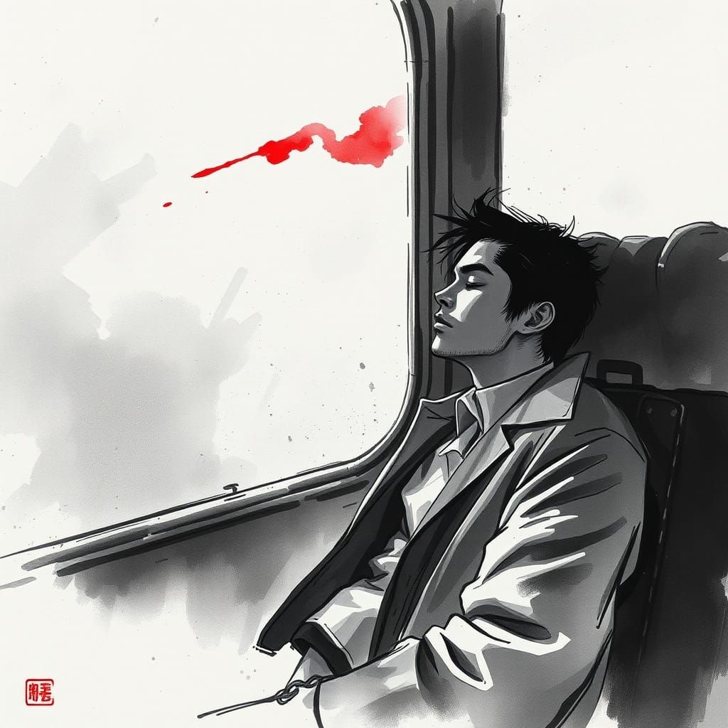 This image shows a man sleeping on a train, depicted in a dramatic, windswept grayscale ink wash style. Expressive brushstrokes and moody lighting create a sense of melancholy and motion.