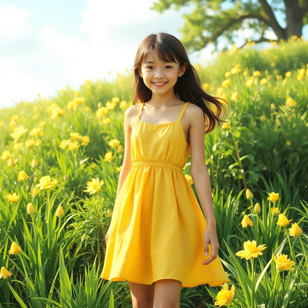 This image shows a vibrant, dreamy scene of a young woman standing in a lush green meadow on a sunny day, surrounded by soft, shimmering colors and a sprinkle of glittering dust in the air, reminiscent of classic watercolor illustrations