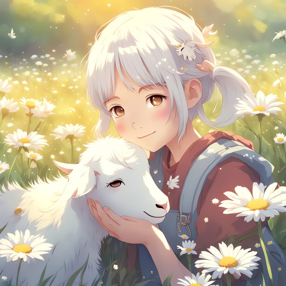 This image shows a cheerful young girl in a red hat with a white goat in a field of daisies. The artwork features a Japanese manga and anime visual style.