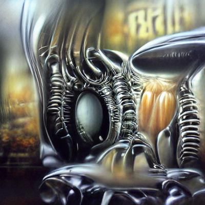 A photorealistic image of a grotesque creature in the style of H.R. Giger. The artwork features intricate details rendered with airbrush techniques and an 8K resolution.