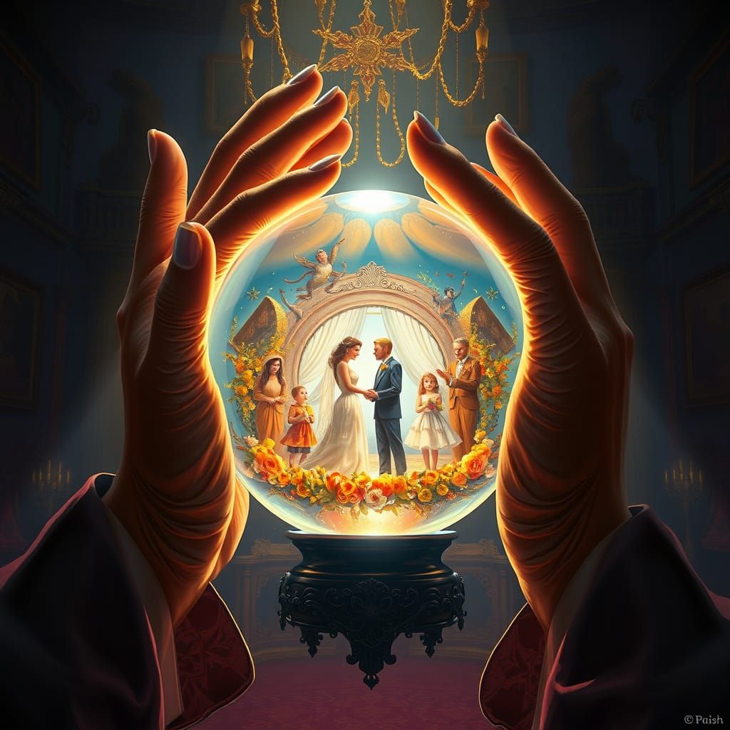 A stunning image of hands suspended over a crystal ball. Inside, a wedding scene unfolds, bathed in golden light and family dreams. The artwork is hyperrealistic, with a splash art style.