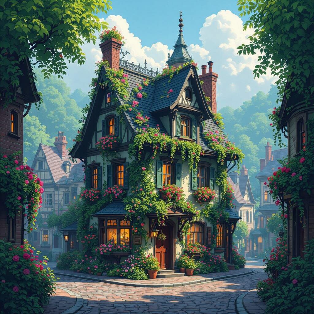 This image depicts a mystical Victorian town with charming architecture, overgrown with vibrant flowers and lush leaves, blending cozy, whimsical, and eerie moods.