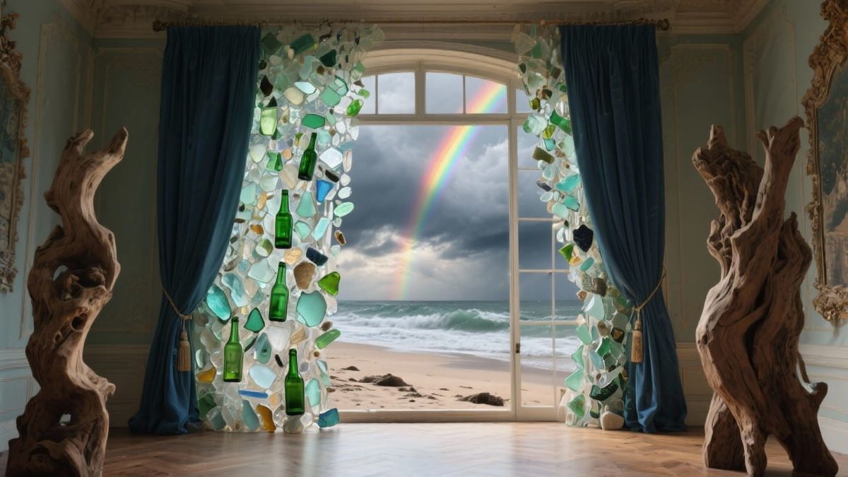 We look from the inside to the outside. The panoramic windows of the 19th century palace mansion are partly covered with curtains made from scintillating found pieces of seaglass in bottle green, matt transparent and dark blue hues. Inside the room are monumental sculptures made from beachwood. Outside ...