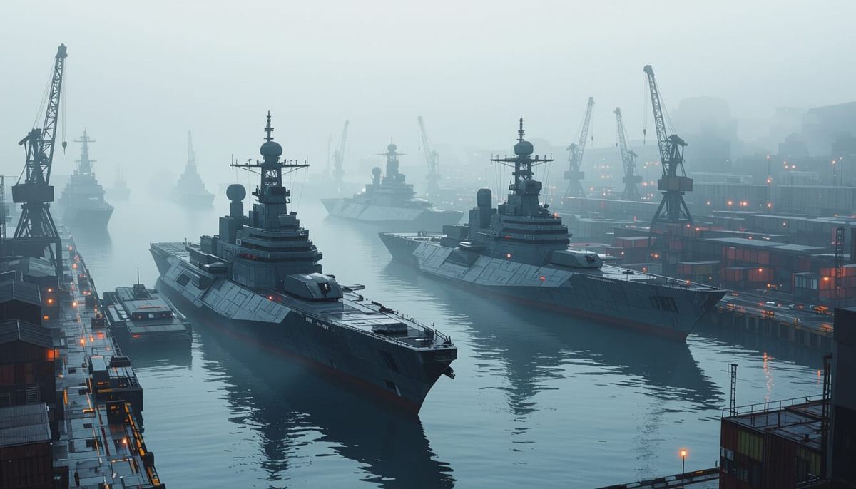 This image shows a harbor in a gritty future, where old warships are repurposed as spaceships. Atmospheric fog hangs over the scene, rendered with photorealistic detail.