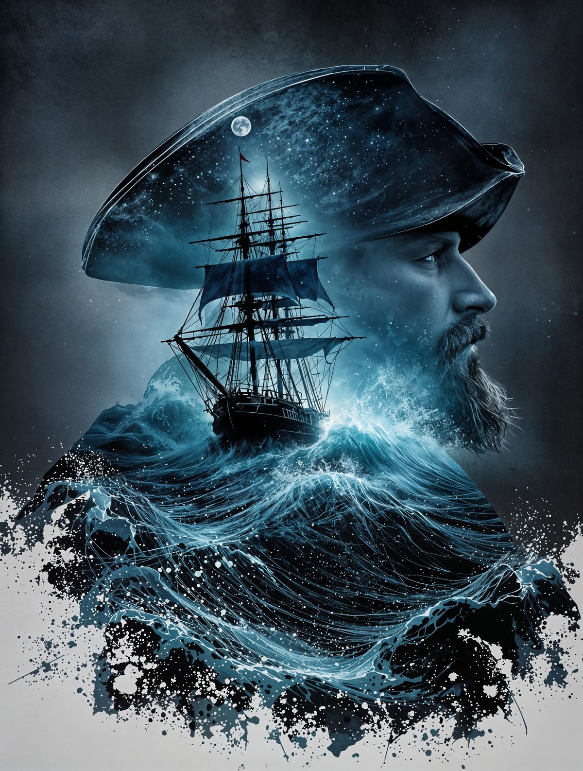 This image shows a dramatic seascape with a pirate captain's profile in the foreground, set against a backdrop of turbulent waves and a large sailing ship silhouette, rendered in a style reminiscent of historical romance illustration.
