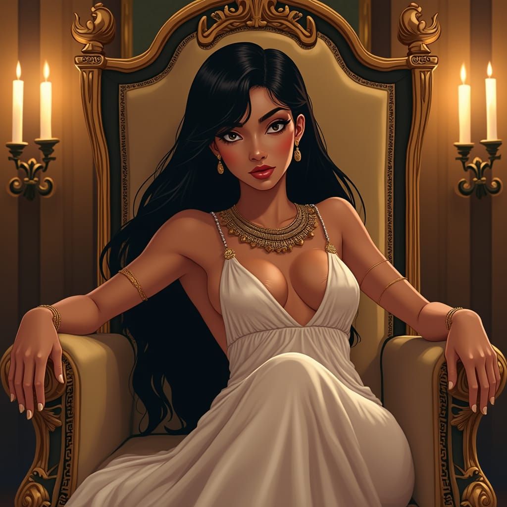 A majestic queen reclines on a lavish throne in her candle-lit bedroom, adorned with hieroglyphics and tapestries. She wears a sheer, white gown that accentuates her toned physique, set against a warm, cinematic backdrop with bold, anime-inspired lines and rich colors.