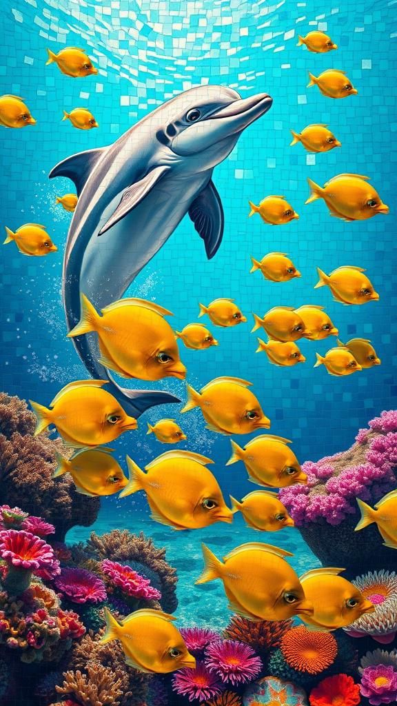 A vibrant dolphin leaps through crystal water, surrounded by golden fish and colorful coral. This image is mosaic art using turquoise and emerald fragments.