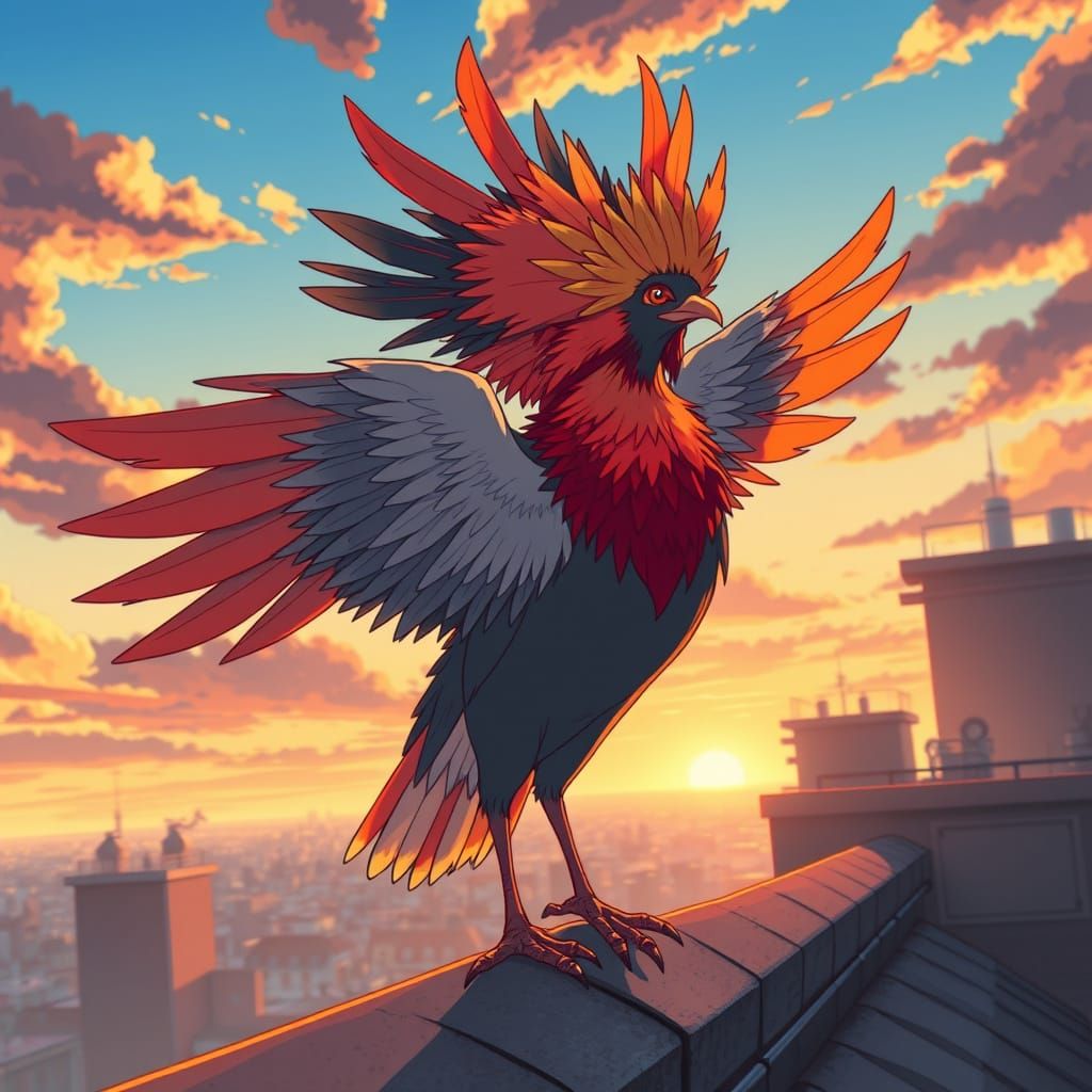 This image shows a pigeon in a fiery headdress, appearing as a phoenix on a city rooftop at dawn. Rendered in a dynamic, vibrant anime style.