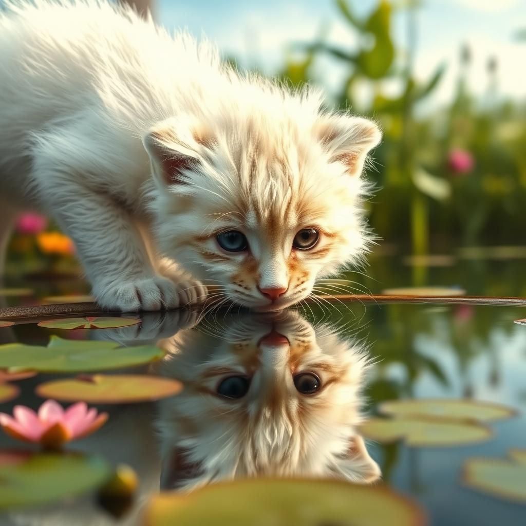 A captivating image of a fluffy white kitten gazing at its reflection in a pond, which reveals a majestic lion. This art showcases fantastical realism.