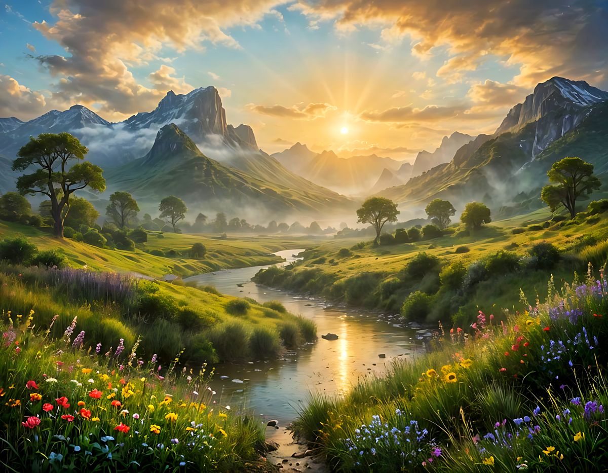 This image captures a serene valley scene after a refreshing rain, with lush greenery, vibrant wildflowers, and a shimmering river reflecting the soft, high-key light.