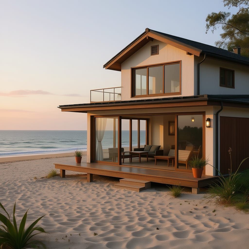 This image features a stunning modern architect-designed house right on the beach. It includes a private, calm beach area with cozy seating on white sand and large windows offering beautiful views.