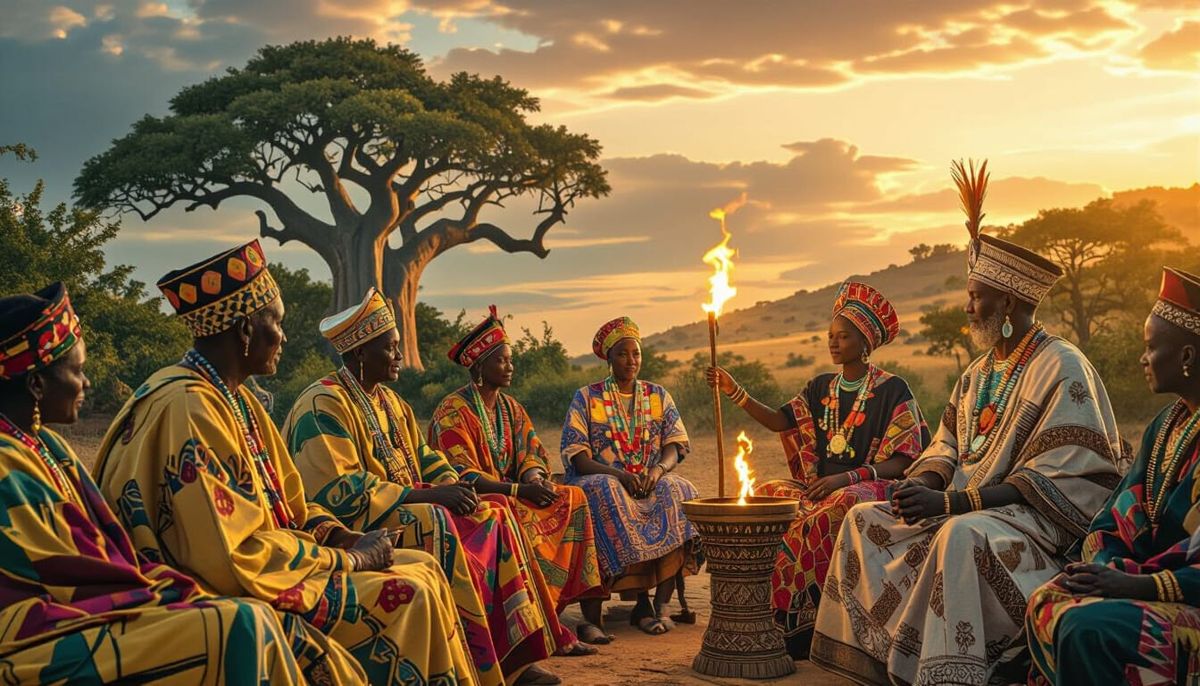 A twilight village council scene featuring African elders in traditional robes under a giant baobab tree. The torchlight casts dramatic shadows in this scene with earthy tones.